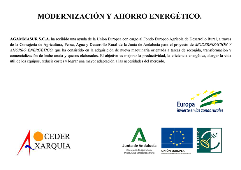 La Agrupación de Ganaderos de los Montes de Málaga S.C.A. ha recibido una ayuda de la Unión Europea con cargo al Fondo Europeo Agrícola de Desarrollo Rural y la Consejería de Agricultura, Ganadería, Pesca y Desarrollo Sostenible de la Junta de Andalucía para MEJORA Y MODERNIZACIÓN DE LA QUESERÍA MONTES DE MÁLAGA, que tiene por objetivos mejorar la competitividad y sostenibilidad de la empresa mediante la modernización de algunos procesos a través de la innovación y la incorporación de nuevas tecnologías, así como la optimización del uso del agua en determinados procesos. Del mismo este proyecto también tiene como objetivo fomentar la igualdad dentro de la empresa, además de revalorizar los recursos naturales locales”.